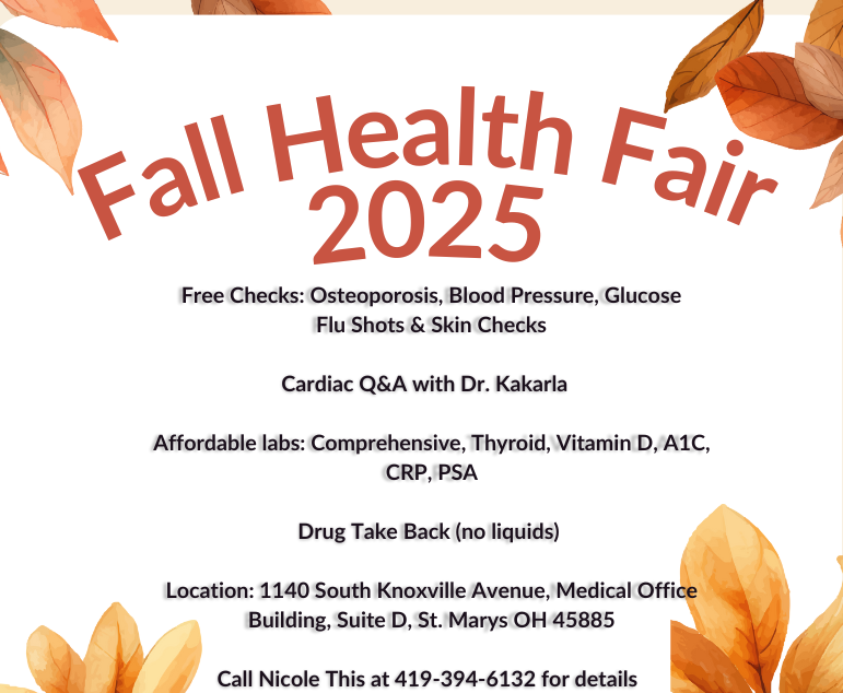 Grand Lake Health System invites the community to take charge of their well-being at the Fall Health Fair, held at Grand Lake Primary Care, 1140 South Knoxville Avenue, Medical Office Building, Suite D, St. Marys, Ohio. The Health Fair is from 7am – 9 am on Saturday, November 8th.
