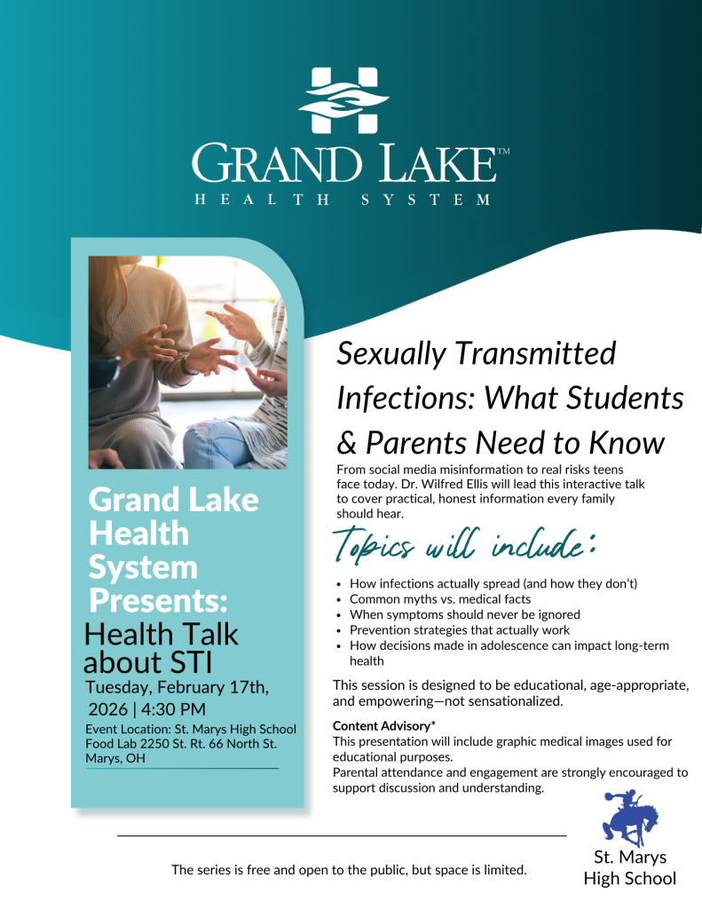 Grand Lake Health System will host a free community health talk, “Sexually Transmitted Infections: What Students & Parents Need to Know,” on Tuesday, February 17, 2026, at 4:30 p.m. at St. Marys High School (Food Lab, 2250 St. Rt. 66 North, St. Marys, OH).